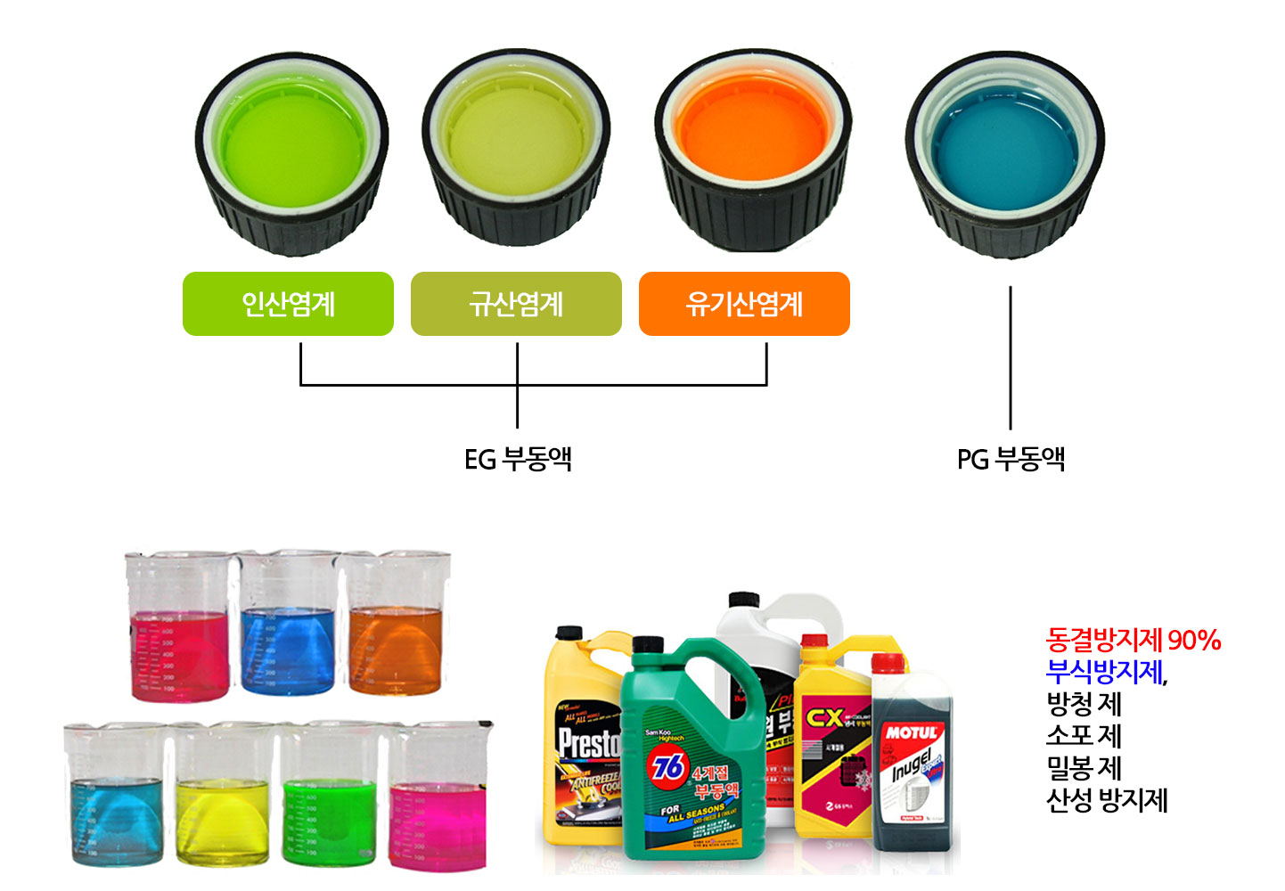 2) 종류 : 부동액의 종류는 크게 EG 부동액과 PG부동액으로 구분되는데 EG계열의 부동액을 많이들 사용하고 있다.